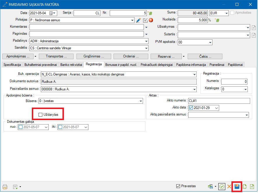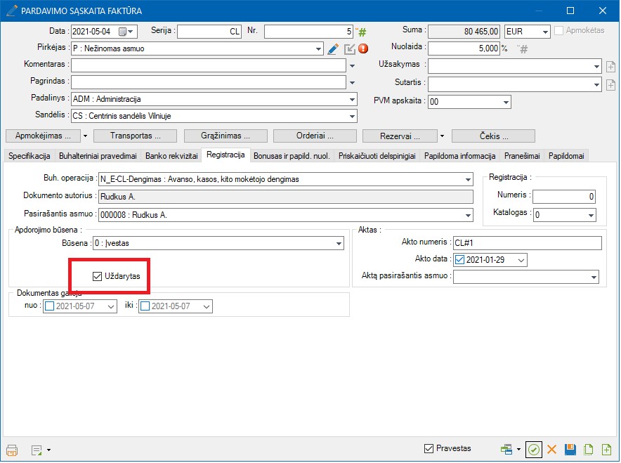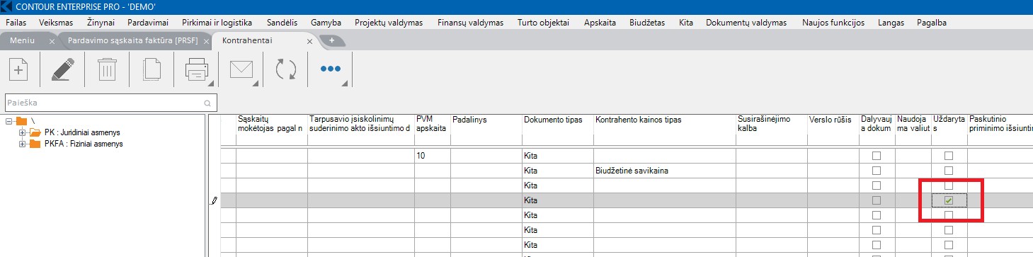 Programoje Contour Enterprise visiems dokumentams gali būti uždėtas požymis Uždarytas. Programa neleidžia koreguoti dokumento, kur požymis Uždarytas yra nurodytas. Tačiau vartotojas gali nuimti požymį Uždarytas, pakoreguoti dokumentą ir vėl uždėti požymį.