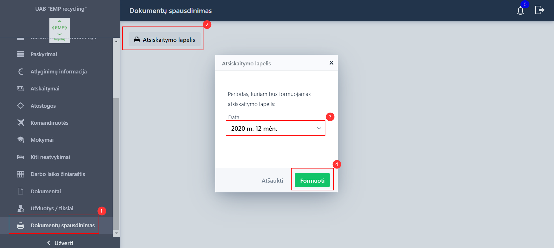 - Nurodyti periodą ir paspausti mygtuką Formuoti. Norint atsisiųsti – spausti Atsisiųsti, o norint atsispausdinti – spausti Spausdinti ir atsispausdinti naudojant standartines naršyklės funkcijas.