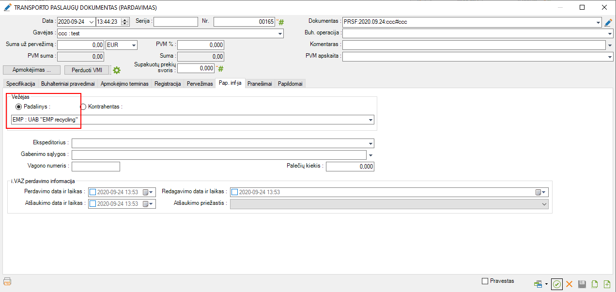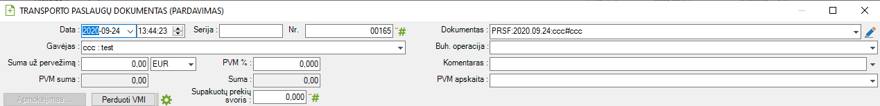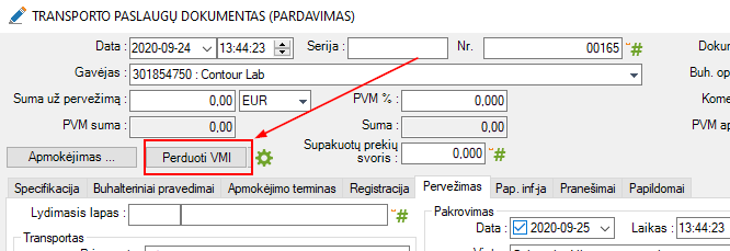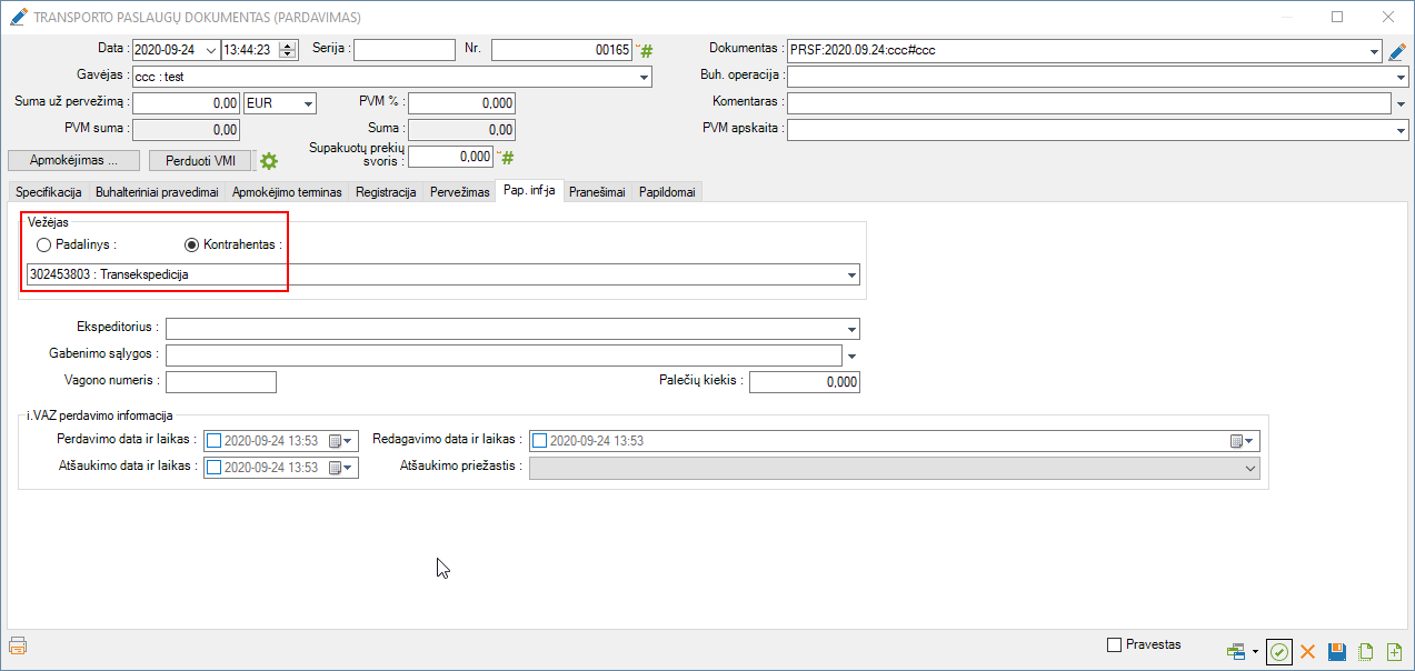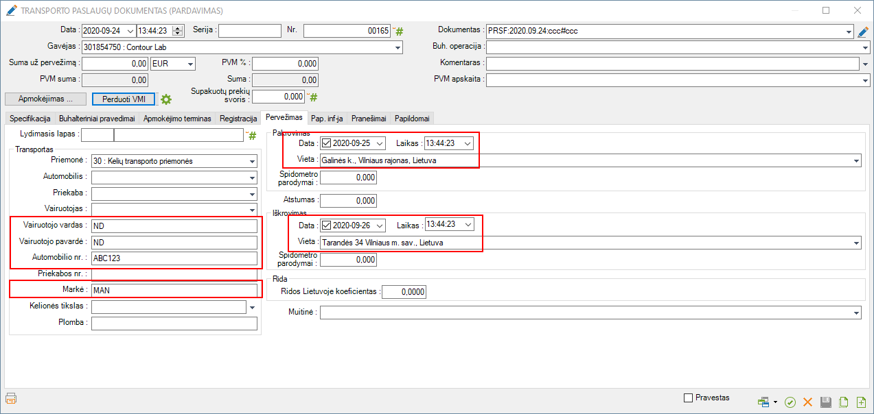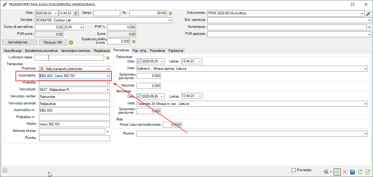 Tada, skirtuke Pervežimas reikia supildyti informaciją apie vežimą: