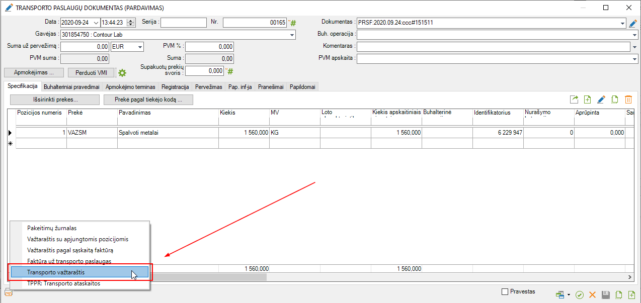 Važtaraščius reikia spausdinti iš programos Contour Enterprise, nebent klientas prašo kitaip. Programoje Contour Enterprise važtaraštis spausdinamas iš Transporto dokumento: