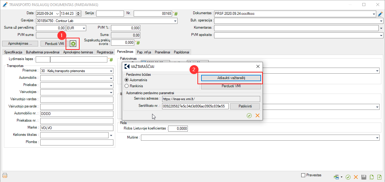 Programoje Contour Enterprise PRO IV yra galimybė perduoti elektroninių važtaraščių duomenis į VMI automatiškai. Su transportu susijusi informacija turi būti suvesta į Transporto paslaugų (pardavimas) dokumentą (TPPR), o iš ten gali būti išsiųsta į VMI spaudžiant mygtuką Perduoti VMI.
