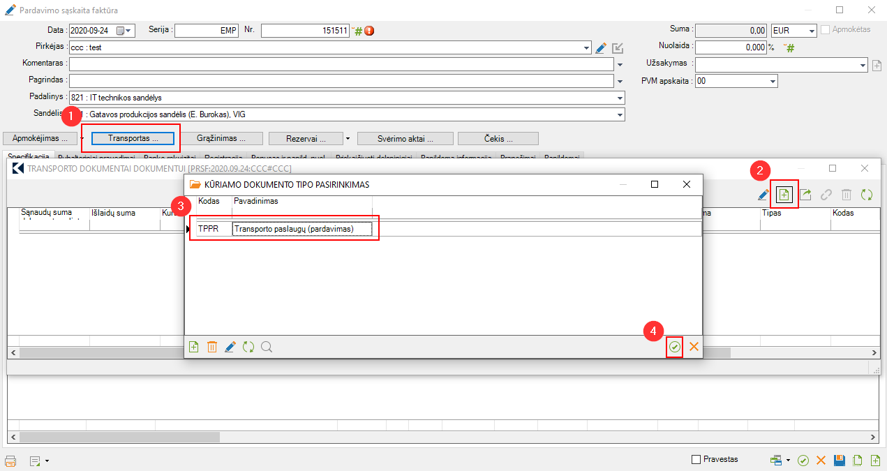 Norint sukurti TPPR dokumentą, turi į programą turi būti įvestas pardavimo dokumentas.