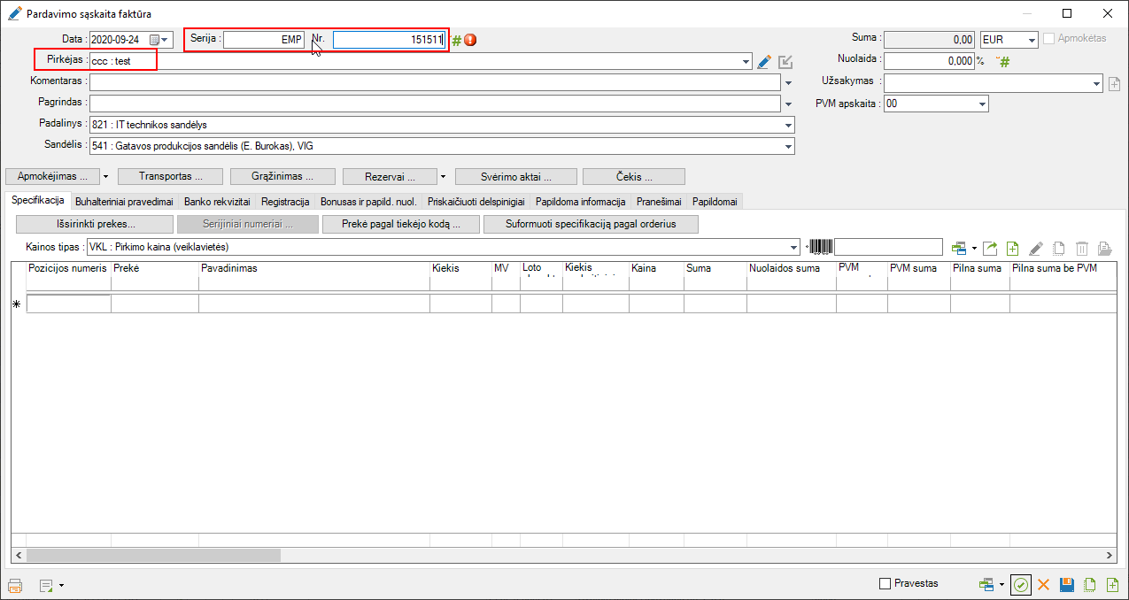 Viršutinė dokumento dalis susipildo automatiškai pagal pardavimo faktūros duomenis: