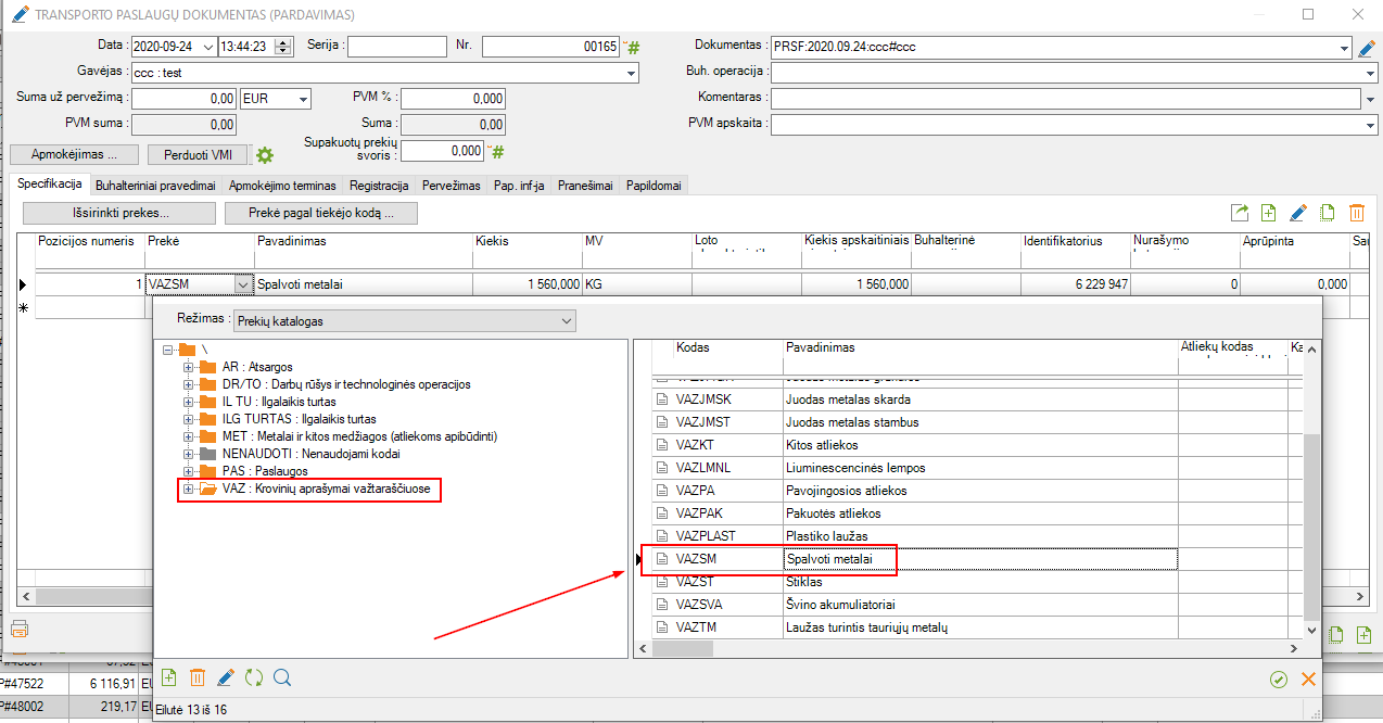 Apatinėje dokumento dalyje (specifikacijoje) reikia įvesti krovinio aprašymą ir kiekį. Krovinio aprašymas – trumpas vežamo krovinio apibūdinimas, kuris turi būti pasirinktas iš prekių medyje, VAZ : Krovinių aprašymai važtaraščiuose kataloge, esančių prekių. Pvz. vežant spalvotus metalus, reikia pasirinkti prekę VAZSM : Spalvoti metalai: