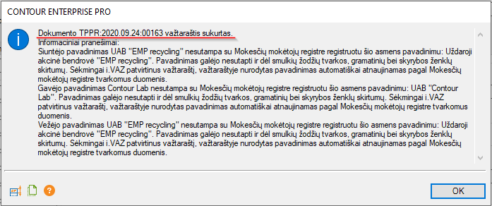 Programa informuoja ar pavyko sukurti elektroninį važtaraštį VMI sistemoje, taip pat parodo bet kokią papildomą informaciją, kurią gavo iš VMI. Jei važtaraštį sukurti pavyko: