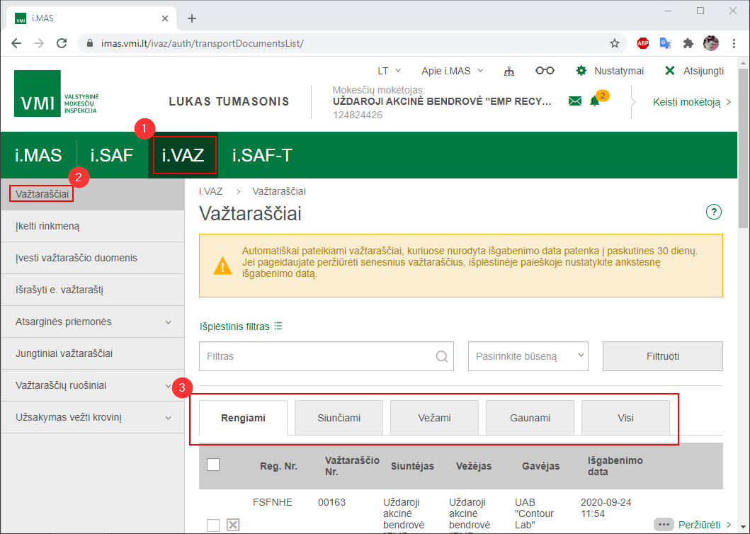 Elektroninius važtaraščius peržiūrėti, pildyti, taisyti ir atšaukti galima ir VMI sistemoje, kurią galima pasiekti per naršyklę adresu https://imas.vmi.lt/isaf/