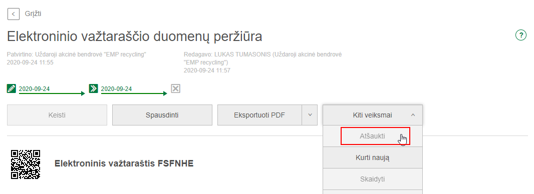 Norint atšaukti važtaraštį, reikia jį atsidaryti, ten pasirinkti veiksmą Atšaukti, nurodyti priežastį ir patvirtinti veiksmą. Atšaukti galima dar neišvežtus važtaraščius.