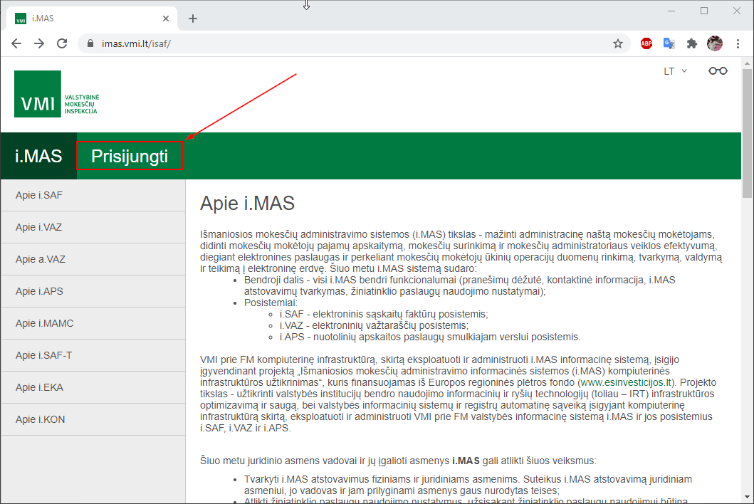 Norint prisijungti prie sistemos, reikia paspausti mygtuką Prisijungti:
