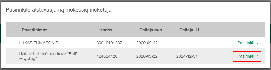 Pasirinkti sau tinkamą prisijungimo būdą ir prisijungti. Prisijungus pasirinkti atstovaujamą mokesčių mokėtoją (t.y. EMP recycling):