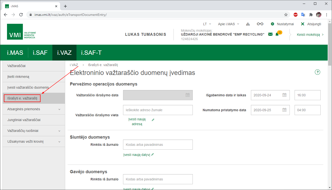 Naujas važtaraštis pildomas pasirinkus meniu punktą Išrašyti e. važtaraštį (svarbu nesumaišyti su meniu punktu Išrašyti važtaraščio duomenis):
