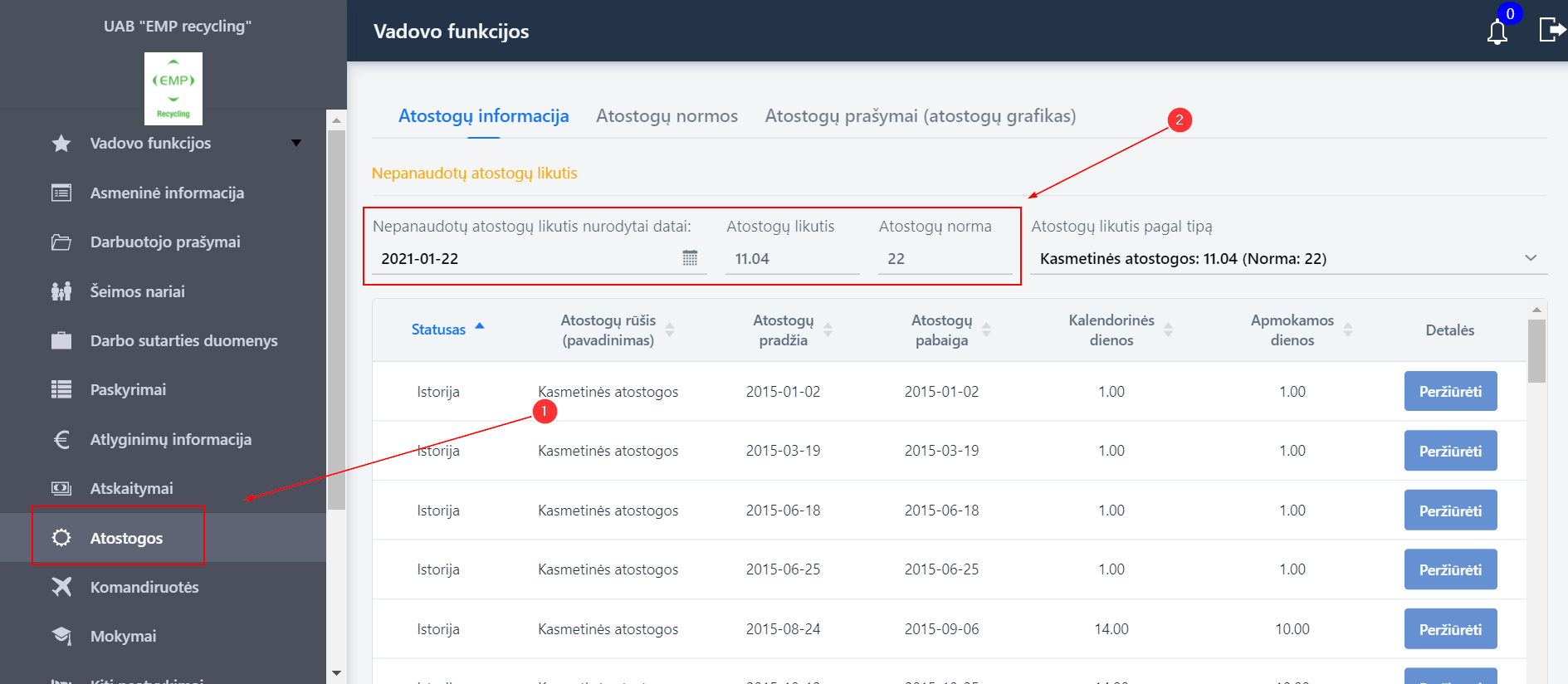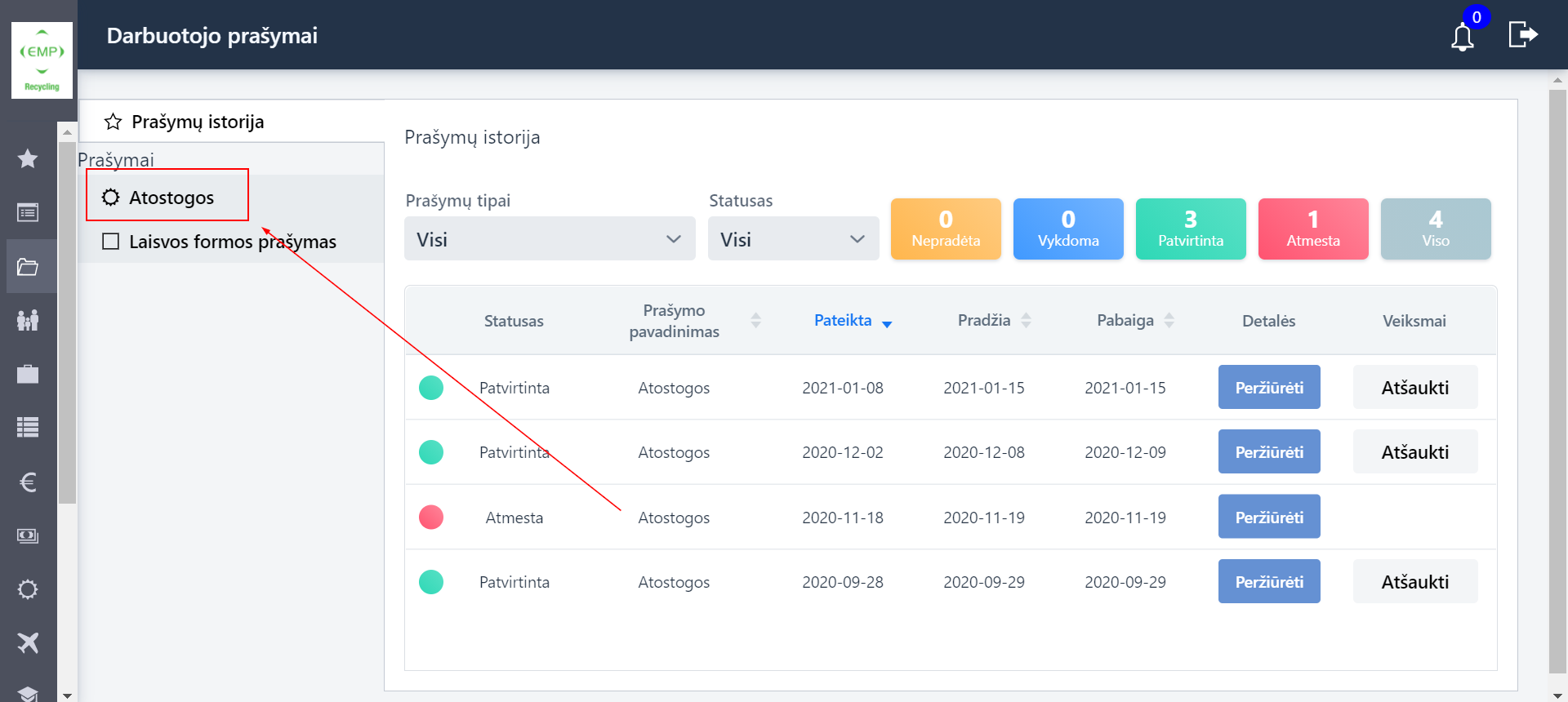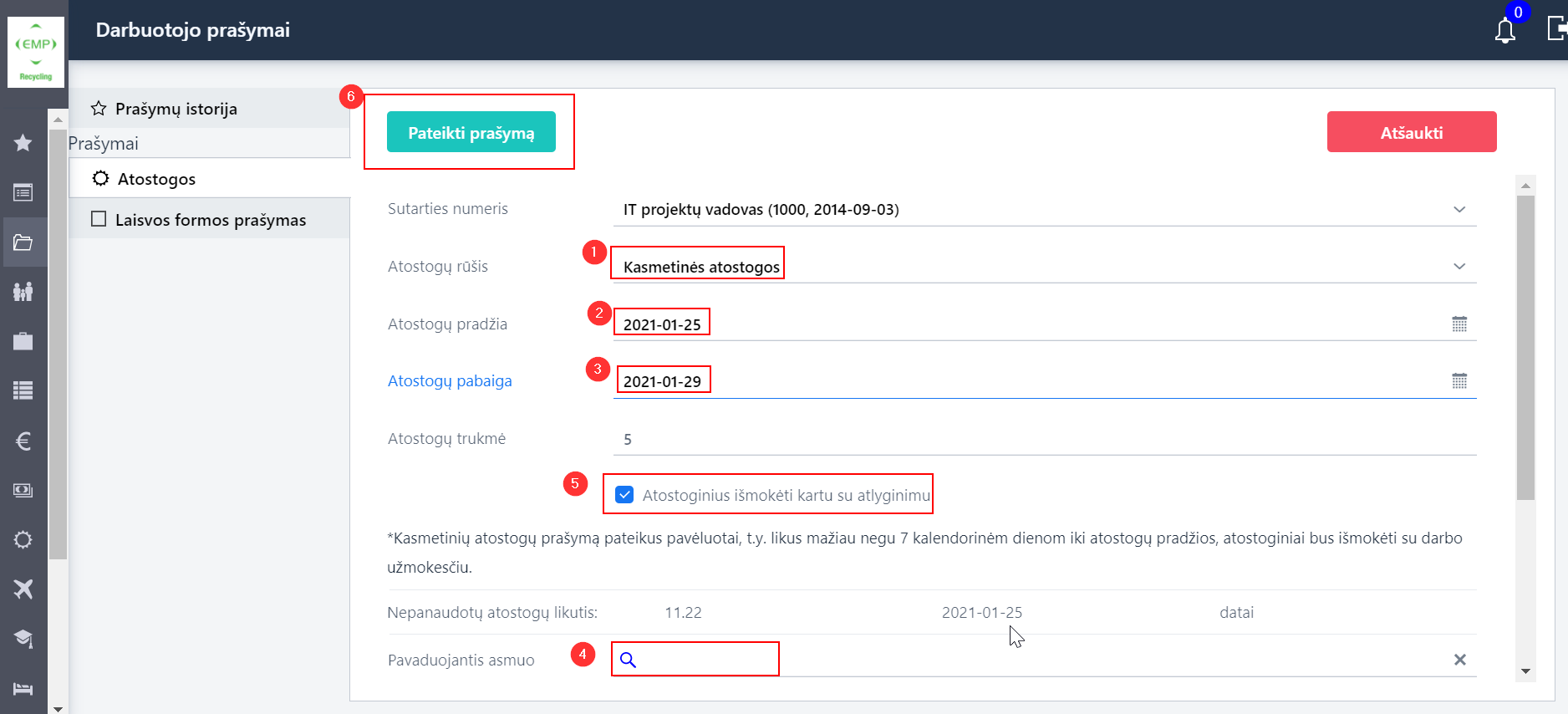 - Meniu kairėje pusėje pasirinkti Atostogos