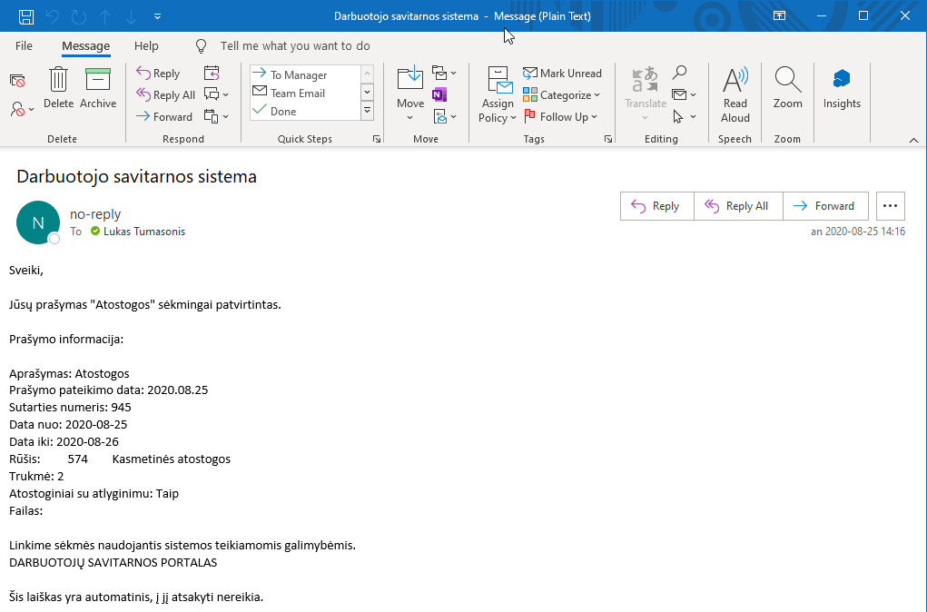 Kai prašymas pateikiamas į sistemą, jį turi patvirtinti vadovas. Kai atostogų prašymas patvirtinamas, el. paštu ateina pranešimas: