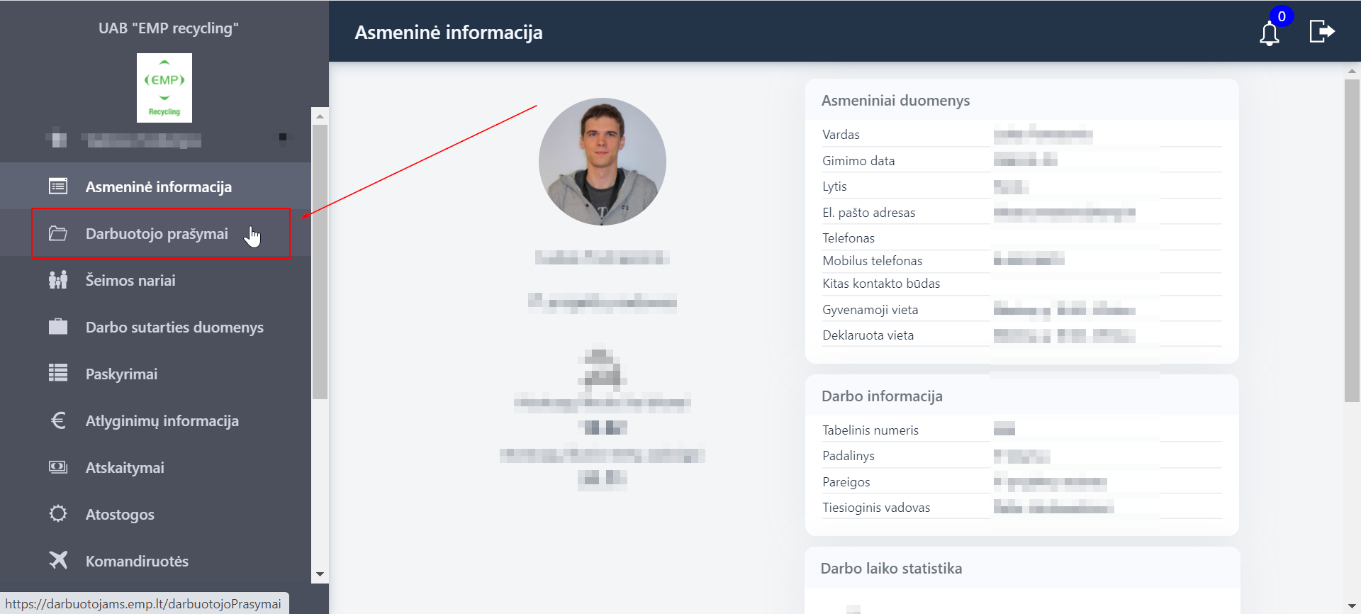 - Meniu kairėje pusėje pasirinkti Darbuotojo prašymai:
