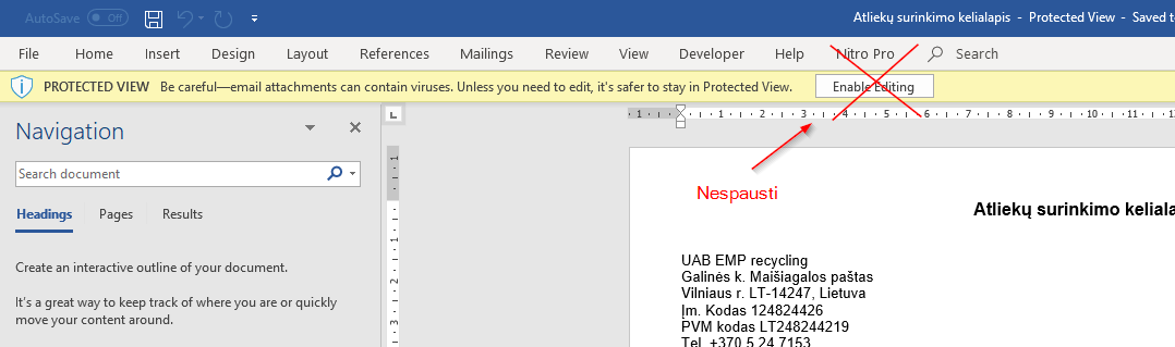 - Neaktyvuokite prisegtų failų macros funkcijos.