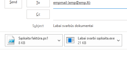 - Jei laiškas turi prisegtų failų – ar prisegtos bylos pavadinimas, plėtinys, ikona ar kita vizuali informacija nekelia įtarimo? Blogų failų pavyzdžiai: