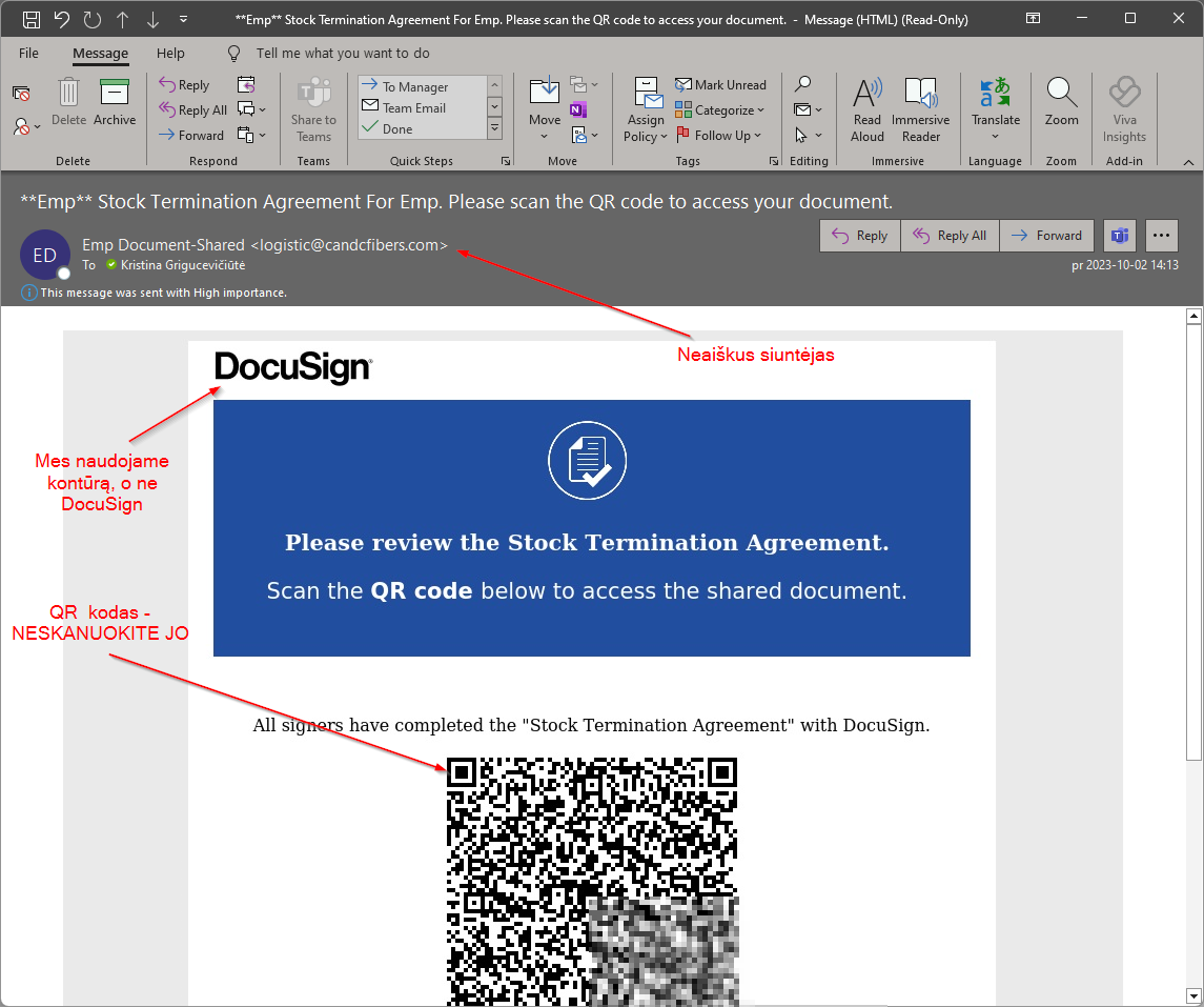 - Labai padažnėjo laiškų, susijusiu su el. parašu. Atkreipsiu dėmesį, kad mes su dokumentais dirbame kontūre, o ne su docusign. Kad pašto filtrams būtų sunkiau atpažinti, pradėjo dėti QR kodus – jokiu būdu jų neskanuokite. Vienas iš pavyzdžių: