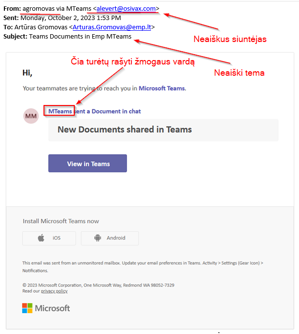 - Netikras laiškas apie Teams pranešimą. Pats laiškas yra paveiksliukas, paspaudus bet kurioje laiško vietoje, atsidaro kenkėjiška nuoroda: