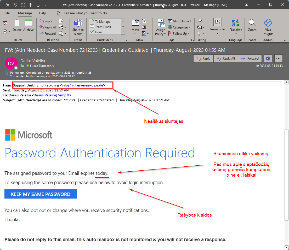 - Klasikinis pavyzdys, bet dėl visa ko priminsiu, kad el. laiškais apie problemas su jūsų paskyra informacija nesiunčiama (slaptažodžiai, prisijungimai, neveikiančios nuorodos ir t.t.). Apie bet kokias problemas su IT praneša IT skyrius.
