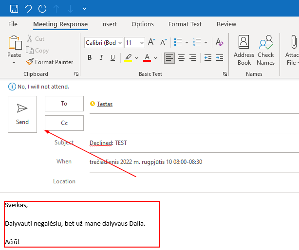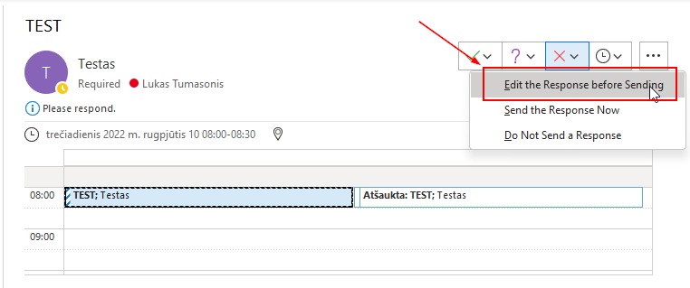 Bei atmesti susitikimą nurodant priežastį organizatoriui. Norint nurodyti priežastį, reikia paspausti mygtuką Edit the Response before Sending: