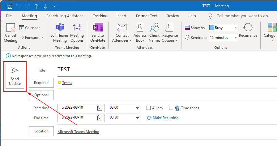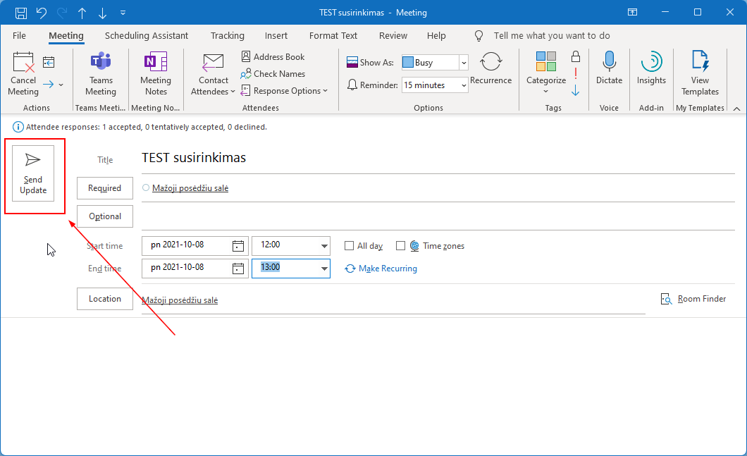Norint pakeisti susitikimo duomenis (laiką, vietą, pridėti dalyvių, pašalinti dalyvius ir pan.), reikia atsidaryti susitikimą kalendoriuje, pakeisti ką reikia ir išsiųsti atnaujintą informaciją.