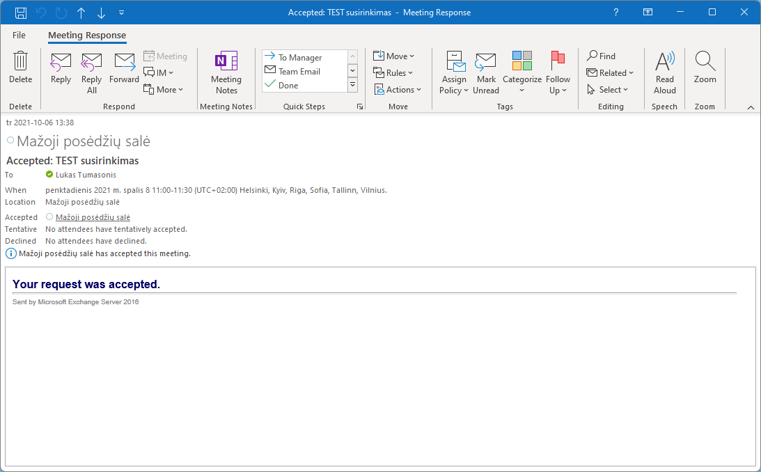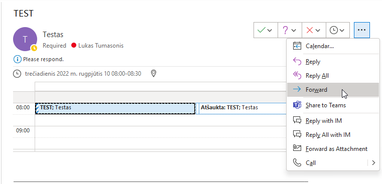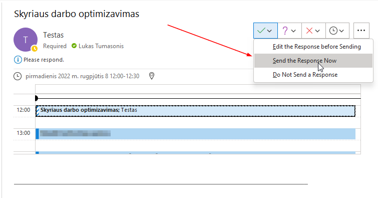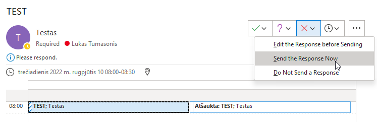 Gavus pakvietimą, jeigu laikas ir vieta tinka, reikia į pakvietimą atsakyti spaudžiant žalią varnelę ir pasirinkus Send the Response Now: