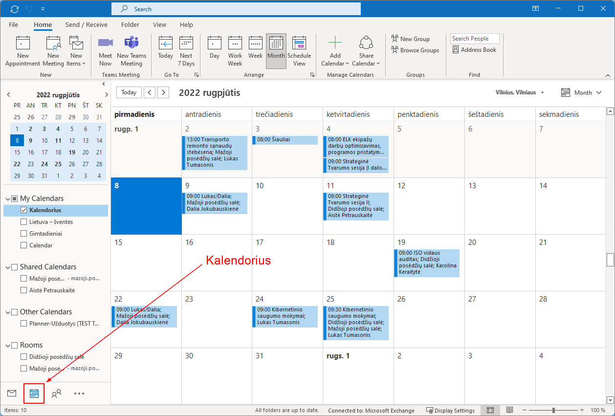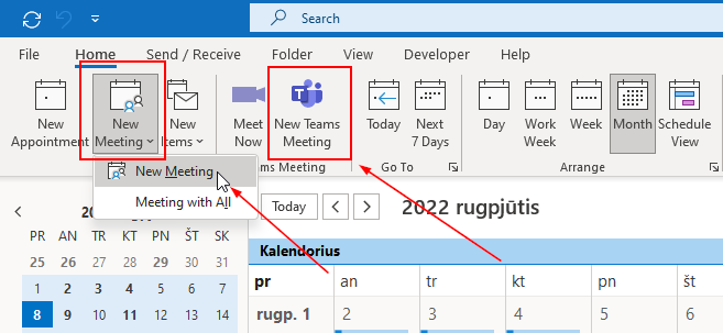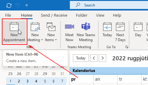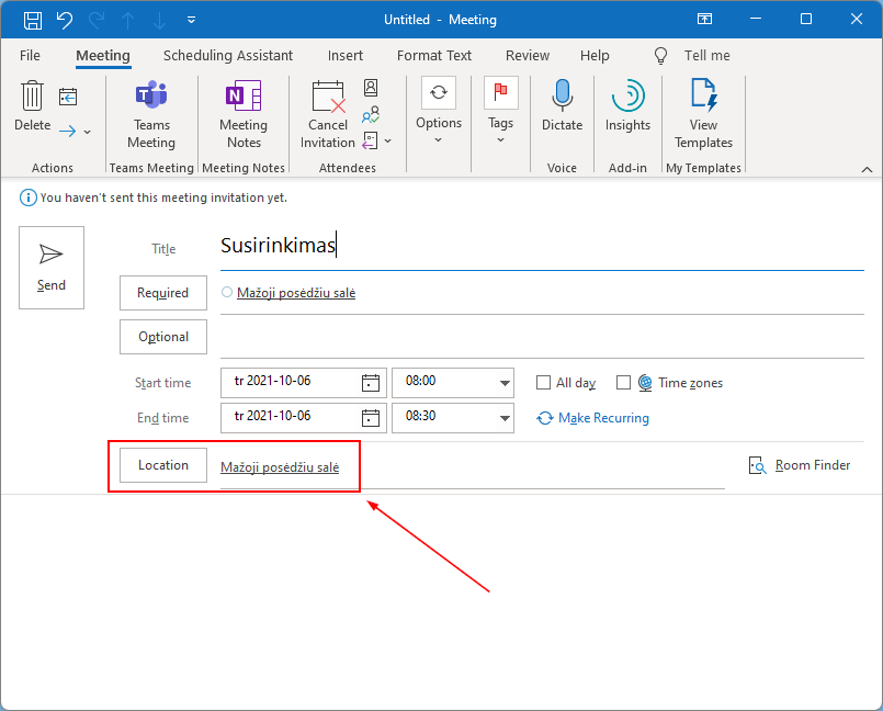 Norint užrezervuoti posėdžių salę, reikia kurti susitikimą savo kalendoriuje be žmonių, o tik su posėdžių sale: