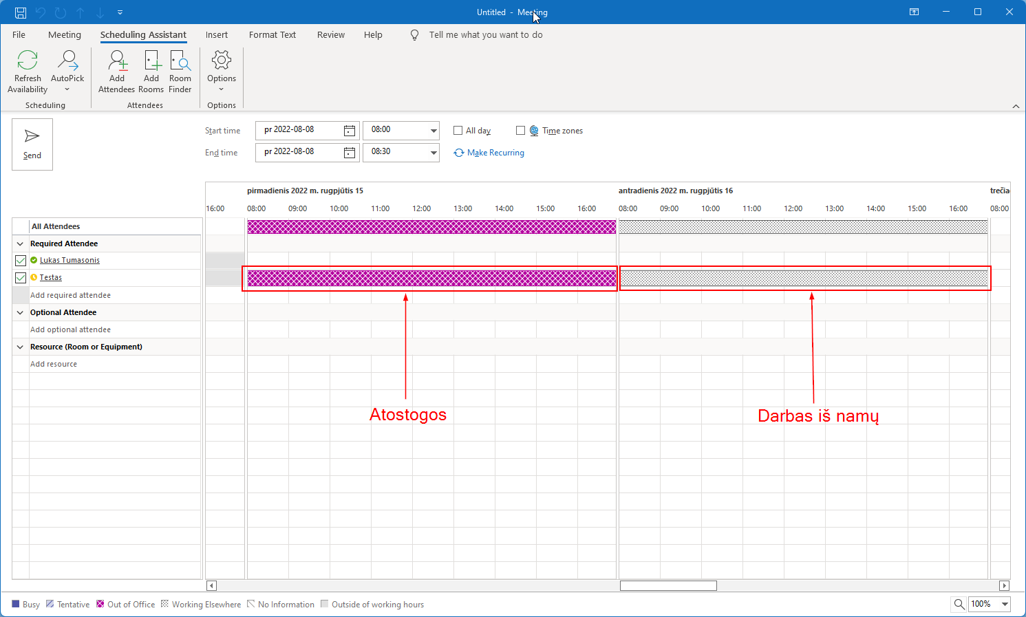 Suradus tinkamą langą, reikia su pele jį pažymėti asistento lange ir laikas automatiškai įsirašo į susitikimo laiko laukus. Tada reikia pašalinti nereikalingą salę ir išsiųsti pakvietimą visiems dalyviams: