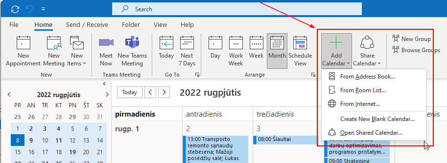 Programoje galima žiūrėti savo arba savo kolegų, komandų (Teams), patalpų (pvz. posėdžių salių), įrangos (pvz. automobilių) ir pan. kalendorius. Norint atidaryti papildomą kalendorių, programos įrankių juostoje, Home skirtuke reikia paspausti Add calendar, pasirinkti rūšį (pvz. Posėdžių salės yra Room List) ir iš sąrašo pasirinkti kalendorių, kurį norite matyti:
