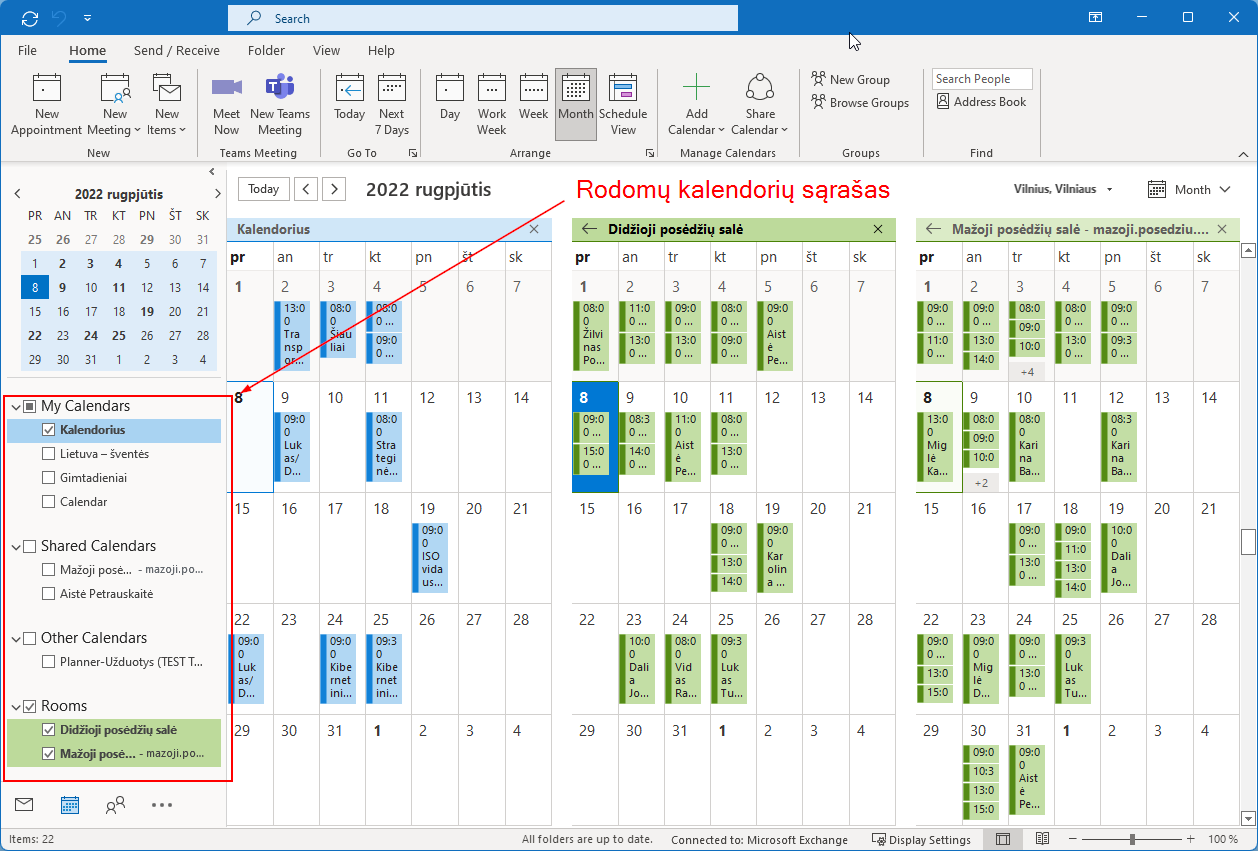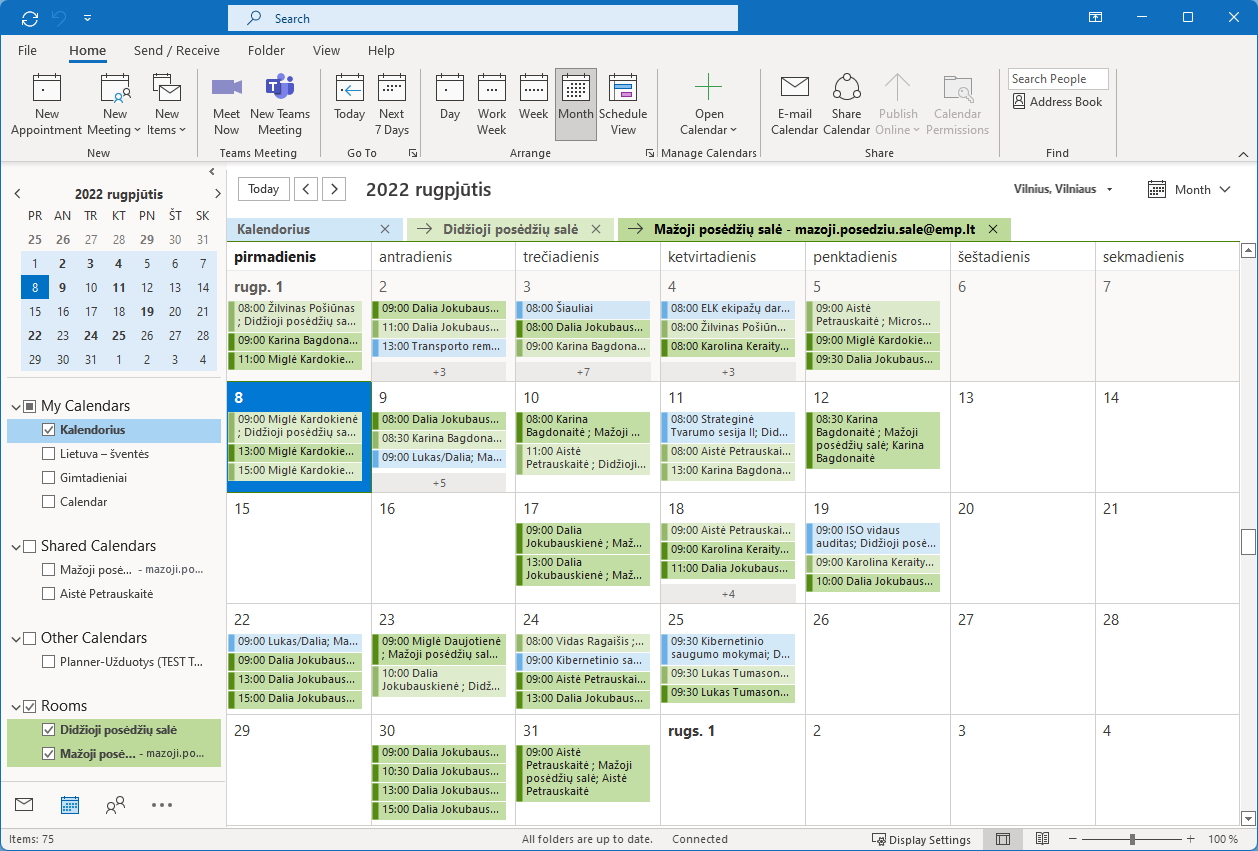 Programa rodo kalendorius, ant kurių yra uždėtos varnelės kalendorių sąraše. Pvz. čia rodomi darbuotojo ir posėdžių salių kalendoriai: