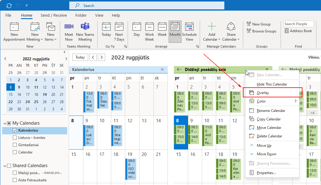Jeigu patogu kalendorius galima sulieti į vieną vaizdą. Norint tą padaryti reikia paspausti ant norimo sulieti kalendoriaus ir pasirikti Overlay: