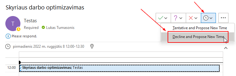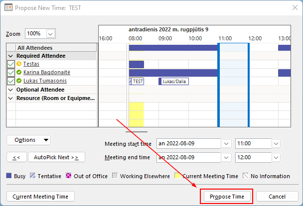 Atsidariusiame lange pasirinkti kitą laiką ir paspausti Propose Time: