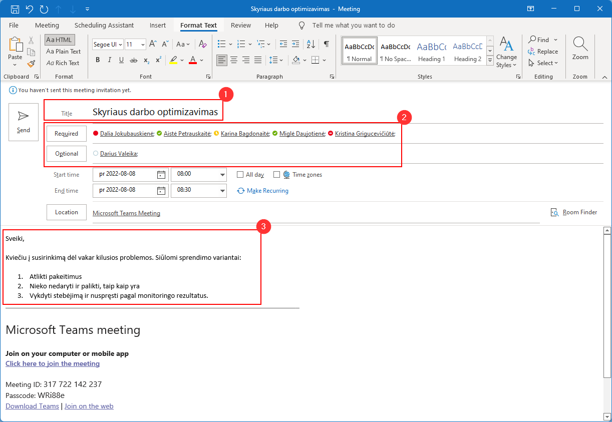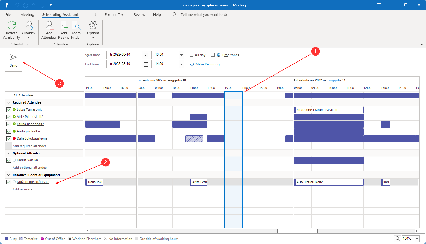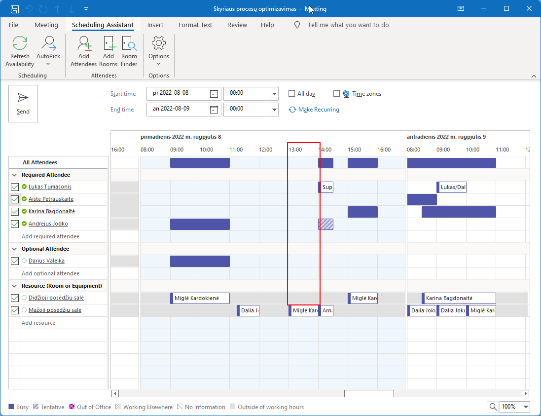 Pvz. šiame pavyzdyje nurodytiems dalyviams tinkamas laikas yra rugpjūčio 8 d. 12:00-13:00 didžiojoje posėdžių salėje: