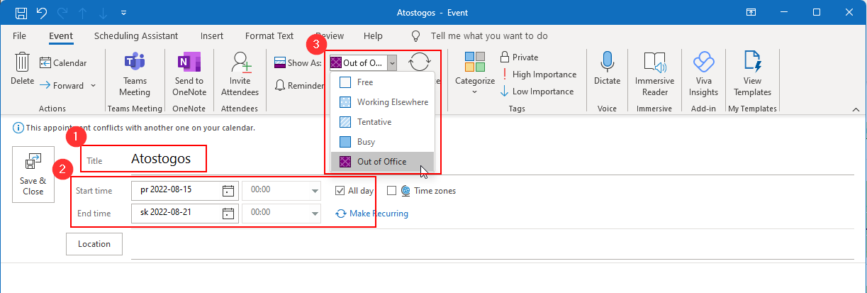 Žymėjimas kalendoriuje yra svarbus, kadangi darbuotojai nemato (jeigu nekeitėte privatumo nustatymų) jūsų įvykio aprašymo. Pasirinkus žymėjimą, kitiems darbuotojams bus paprasčiau organizuoti susirinkimus. Visais atvejais žymėjimas turi būti Busy, išskyrus: