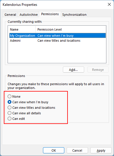 Pastaba. Paprastai čia turėtų būti tik vienas įrašas – My Organization, o prie leidimų nustatyta Can view when I‘m busy. Kitokie nustatymai turėtų būti derinami su tiesioginiu vadovu! Be reikalo nustatymų nekeiskite.