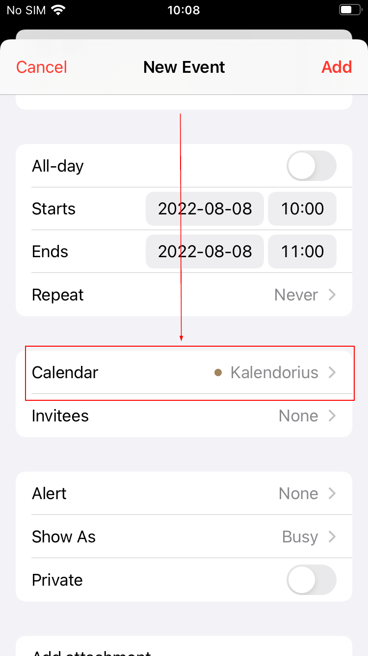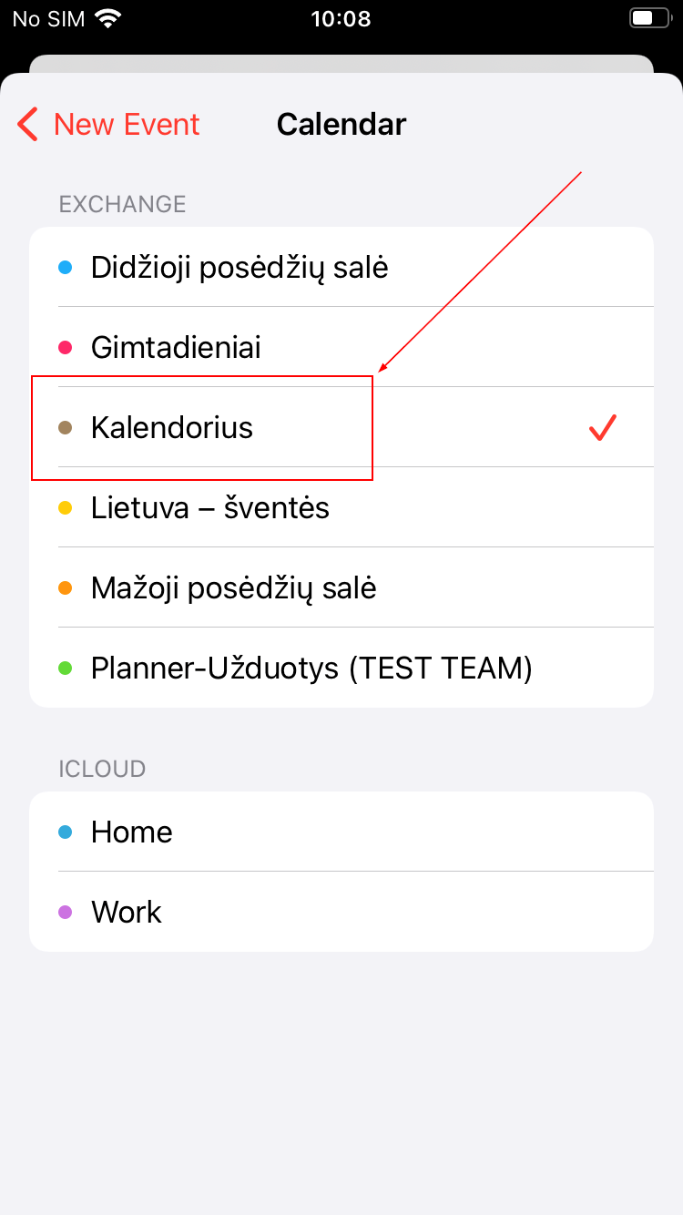 iOS telefonuose, gamyklinėje kalendoriaus programėlėje, rodomi kalendoriai iš visų paskyrų. Todėl kuriant įrašą, reikia nustatyti, kad jis būtų kuriamas darbo kalendoriuje: