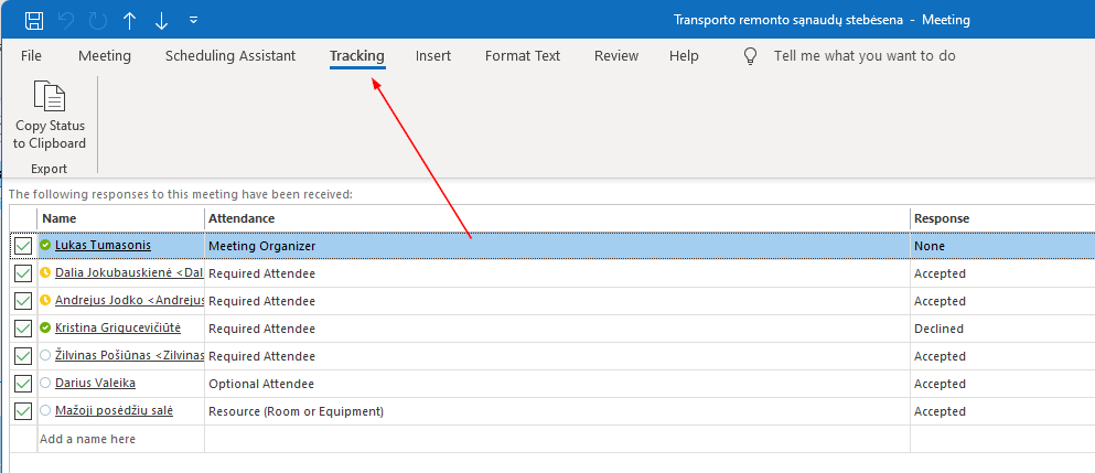 Norint pažiūrėti dalyvių atsakymus, reikia atsidaryti įvykį kalendoriuje ir nueiti į skirtuką Tracking: