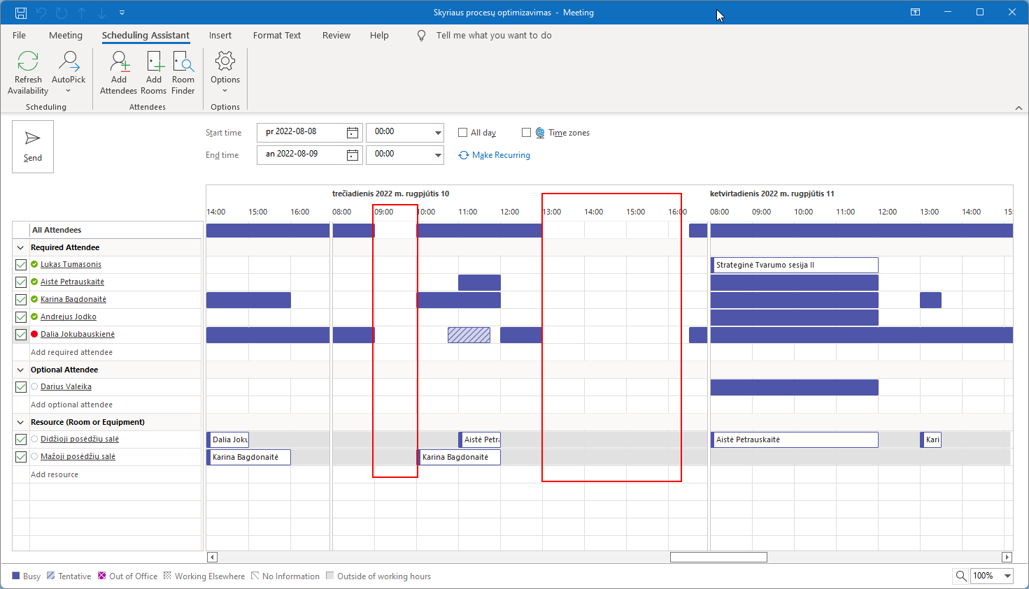 Šiame pavyzdyje dalyviams tinkamas artimiausias laikas yra rugpjūčio 10 d. 09:00 – 10:00 arba 13:00 – 15:30 bet kurioje posėdžių salėje: