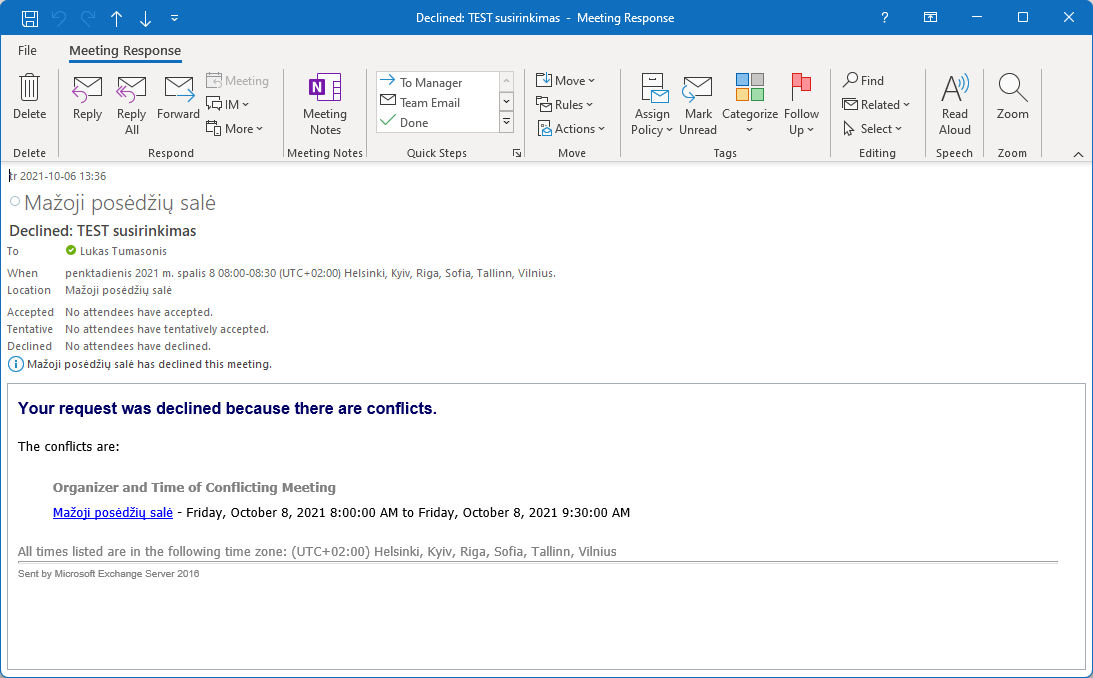Susitikimas atmetamas. Susirinkimo organizatorius gauna naujo laiko pasiūlymą. Jeigu organizatorius sutinka su laiko pakeitimu, jis išsiunčia laiko susitikimo atnaujinimą visiems dalyviams.