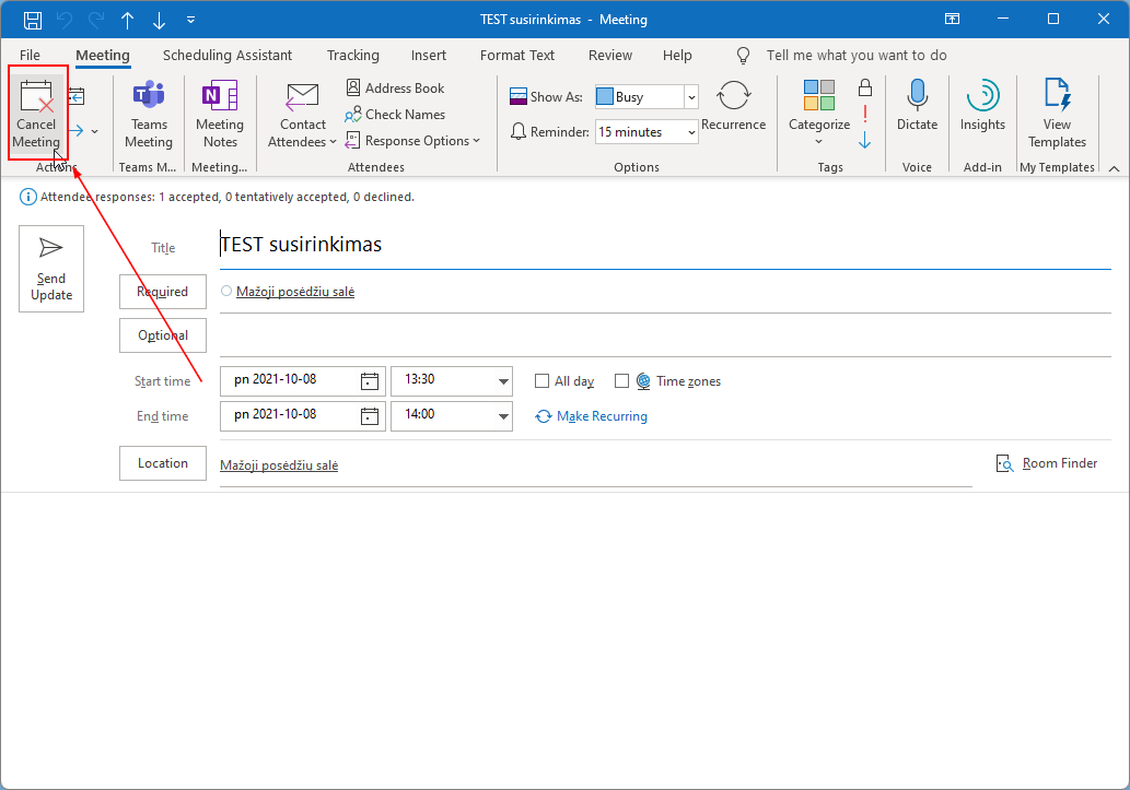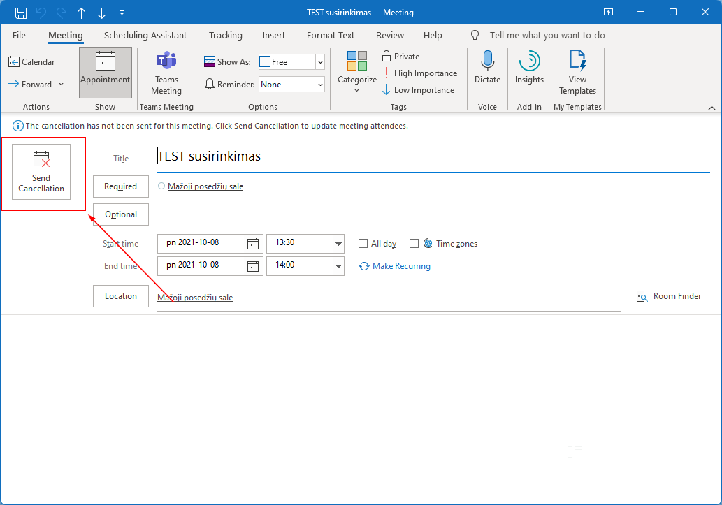 Norint atšaukti susirinkimą – išsiųskite atšaukimą salei: