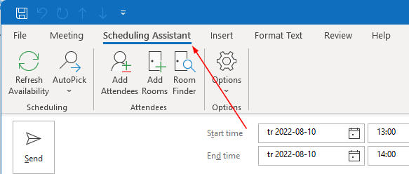 Planavimo asistentas randamas skirtuke Scheduling Assistant: