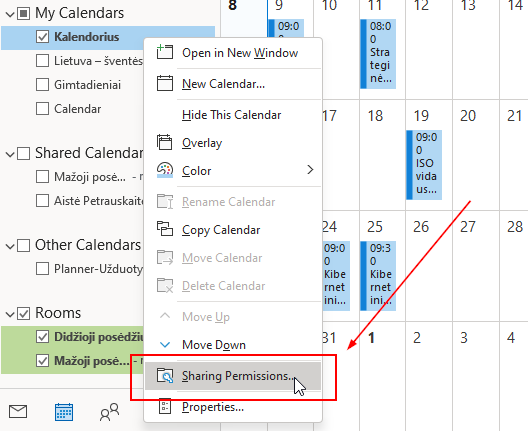 Norint pakeisti kalendoriaus privatumo nustatymus (pvz. visiems darbuotojams rodyti tik užimtumą, o vadovui dar ir antraštę ir vietą), reikia ant savo kalendoriaus paspausti dešiniu pelės klavišu ir pasirinkti Sharing permissions:
