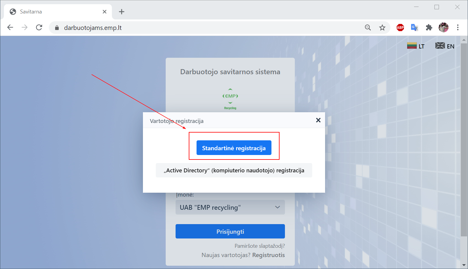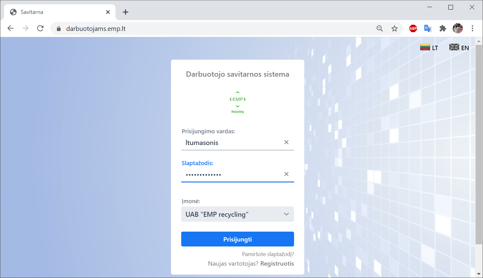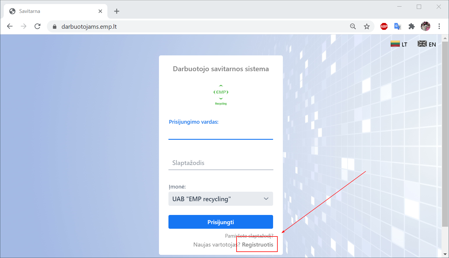 - Naršyklėje atidaryti darbuotojų savitarnos portalą darbuotojams.emp.lt