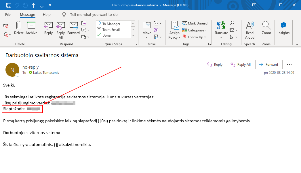 - Nurodytu elektroninio pašto adresu ateis laikinas prisijungimo kodas, kurį reikės pasikeisti pirmą kartą prisijungus prie savitarnos: