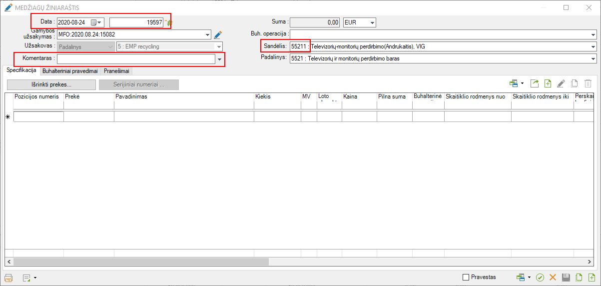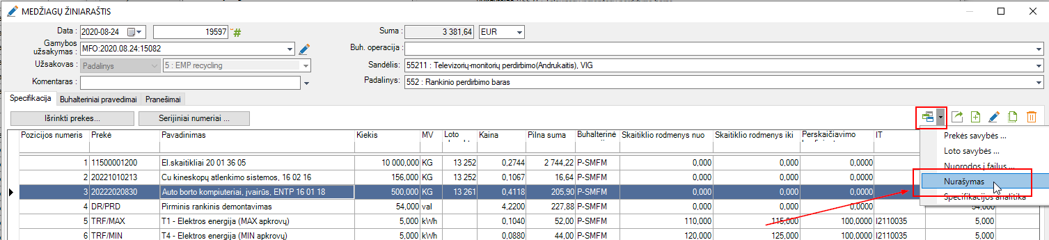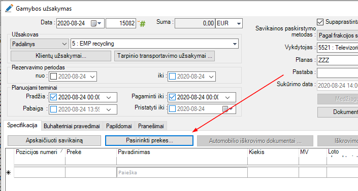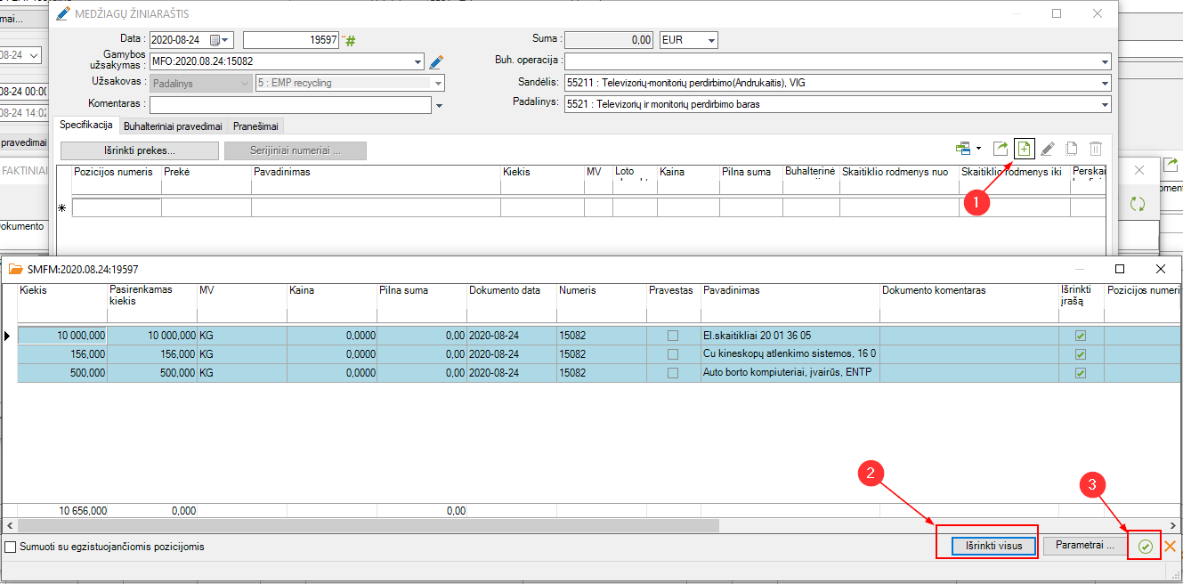 Medžiagas galima arba įvesti rankiniu būdu arba pasirinkti iš sandėlio. Prekių pasirinkimas iš sandėlio – toks pats, kaip formuojant sandėlio orderį: