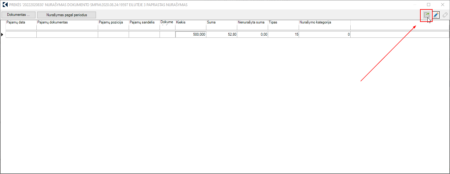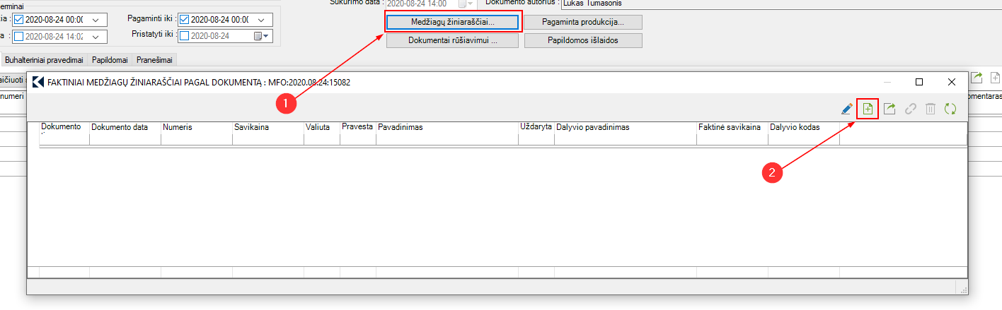 Tada reikia įvesti prekes taip, kaip jos įvestos Gamybos užsakyme. Tuo tikslu reikia paspausti šiuos mygtukus: