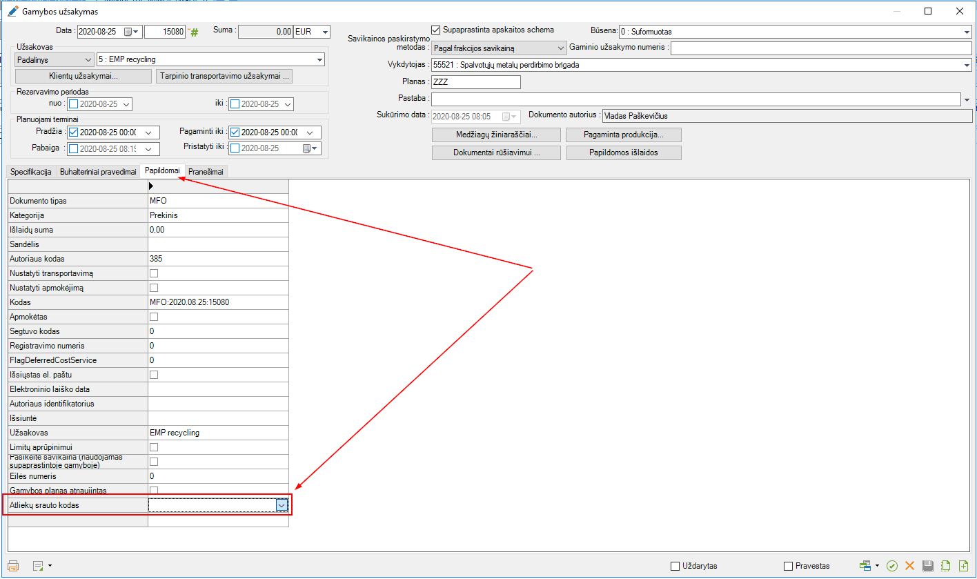 Atliekų srautas nurodomas skirtuke Papildomai:
