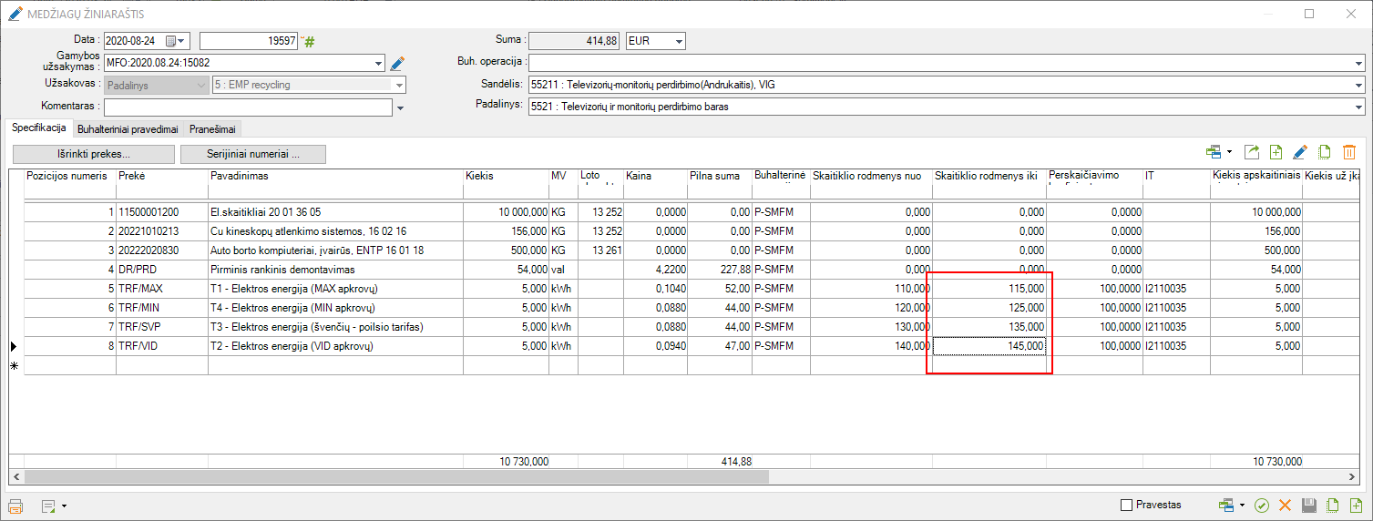 Medžiagų žiniaraštyje susigeneruoja eilutės – rodmenis NUO programa sugeneruoja automatiškai (pagal anksčiau į programą įvestus duomenis), o rodmenis IKI reikia suvesti taip, kaip trečiame kontūre:
