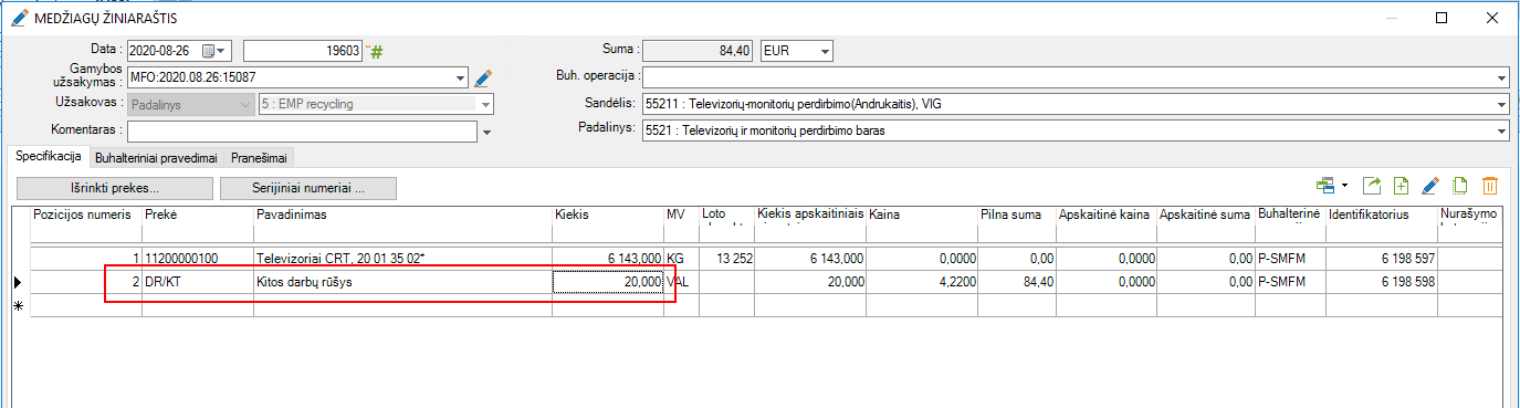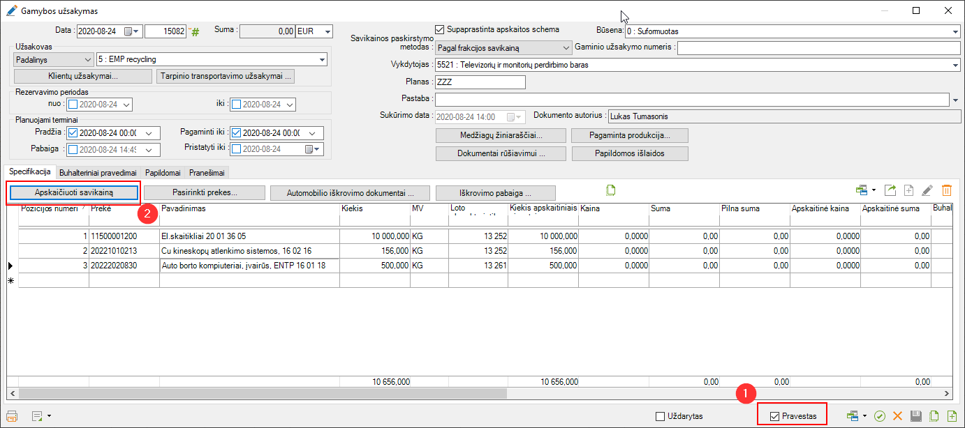 Eilutės dokumente užsipildo taip, kaip Gamybos užsakyme. Jeigu nėra Elektros ar DU sąnaudų, dokumentą galima pravesti.