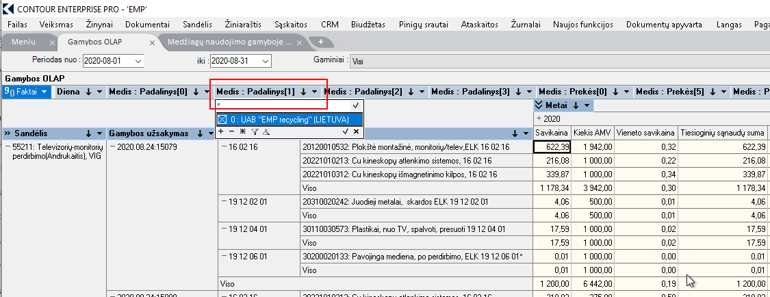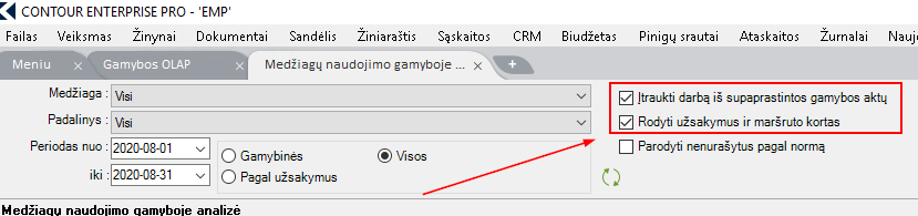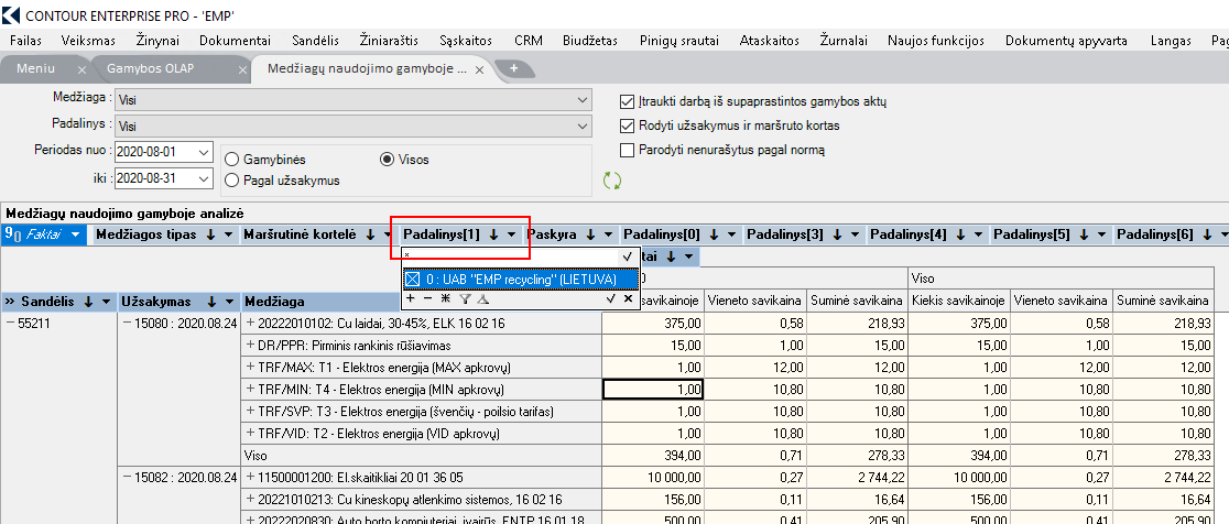 Norint atsifiltruoti gamybas pagal padalinį, geriau naudoti filtrus padalinio arba sandėlio pjūviuose, pvz. taip: