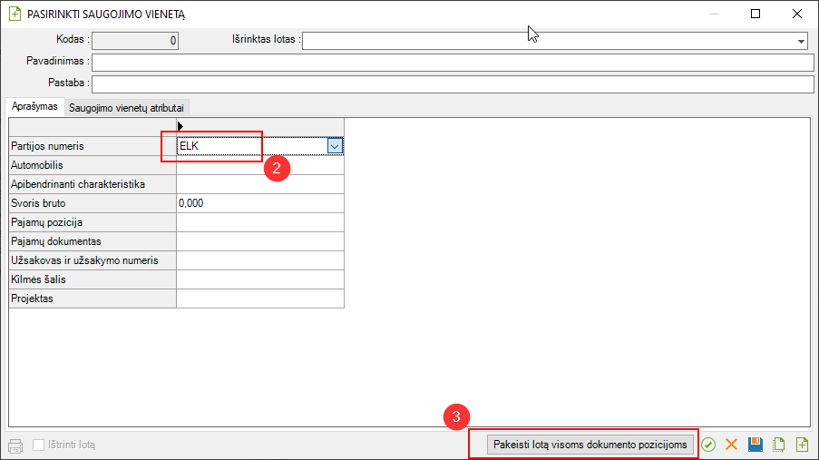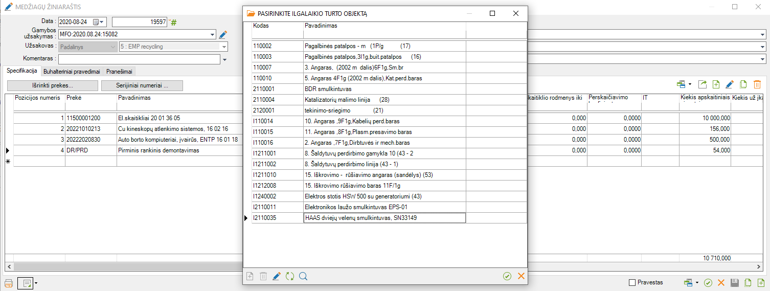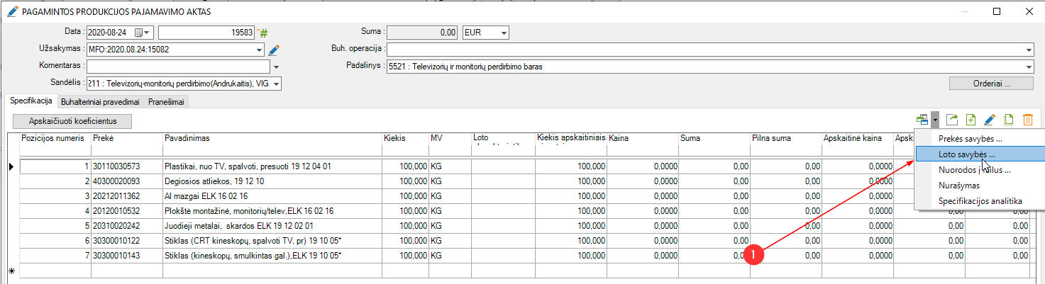 Tada reikia suvesti po gamybos gautas prekes ir jų kiekius. Įvedus prekes, nurodyti prekių partijos kodą: